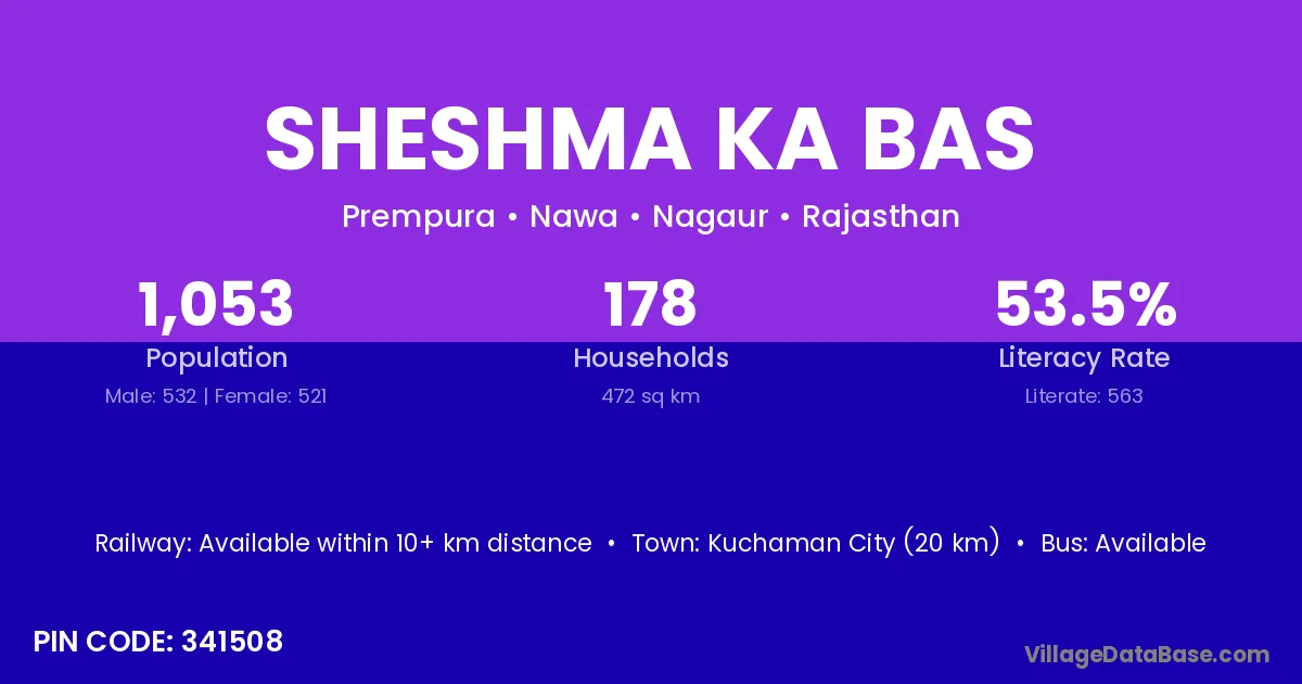 Sheshma Ka Bas village has a total population of 1,053 people, of which 532 are males and 521 are females.