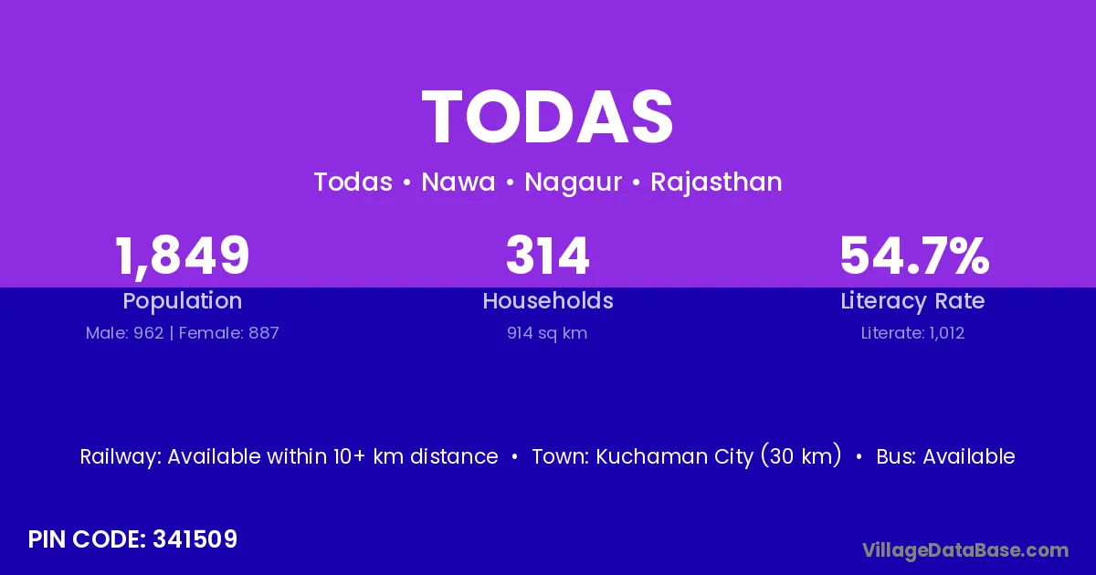Kuchaman City (30 km) is the nearest town to Todas village for major economic activities and is located approximately 30 km away.