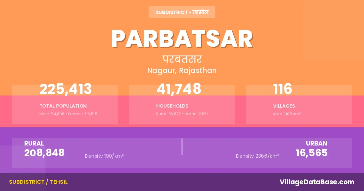 According to the 2011 census The total area of Parbatsar Tehsil is 1105 km², with a population of 225413 people. The population density is 204 inhabitants per square kilometre, and there are approximately 41748 houses in the sub district.