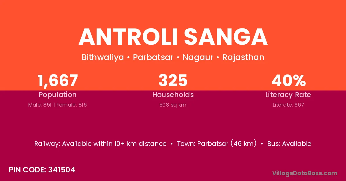Parbatsar (46 km) is the nearest town to Antroli Sanga village for major economic activities and is located approximately 46 km away.