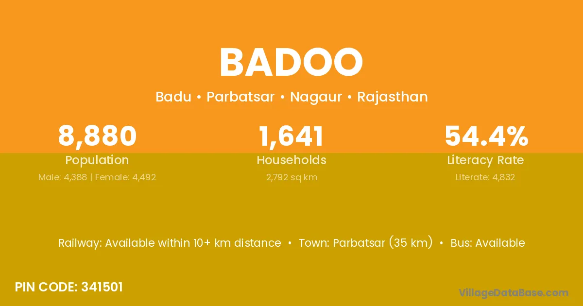 Parbatsar (35 km) is the nearest town to Badoo village for major economic activities and is located approximately 35 km away.