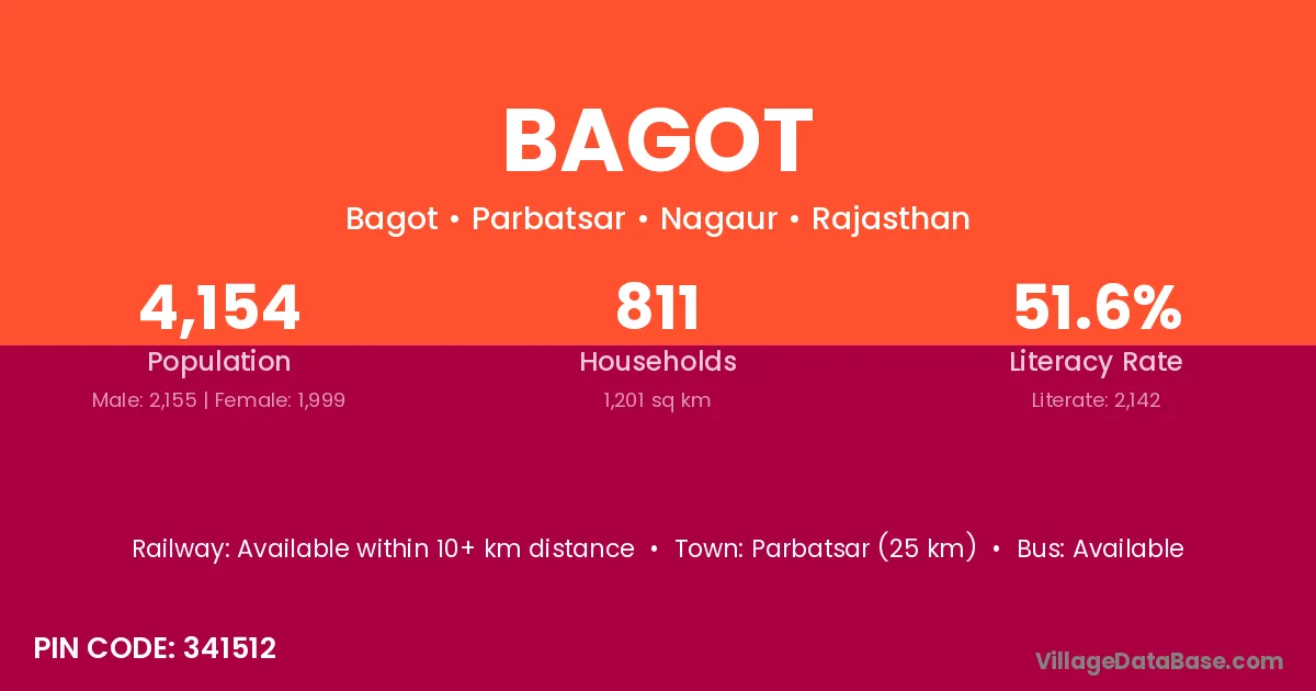 Parbatsar (25 km) is the nearest town to Bagot village for major economic activities and is located approximately 25 km away.