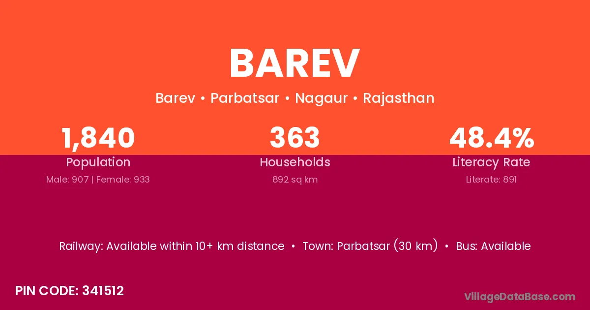 Parbatsar (30 km) is the nearest town to Barev village for major economic activities and is located approximately 30 km away.