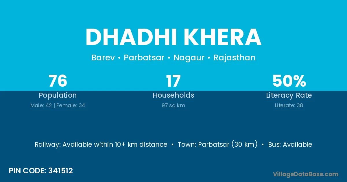 Parbatsar (30 km) is the nearest town to Dhadhi Khera village for major economic activities and is located approximately 30 km away.