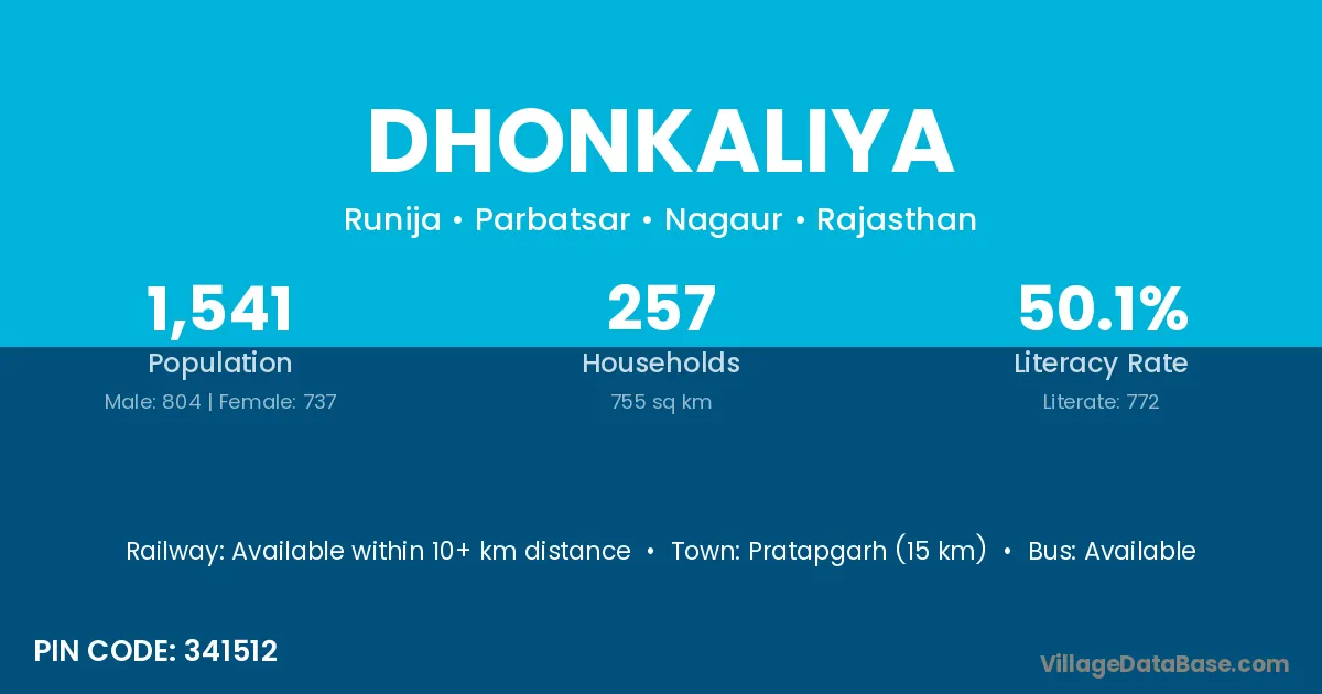 Pratapgarh (15 km) is the nearest town to Dhonkaliya village for major economic activities and is located approximately 15 km away.