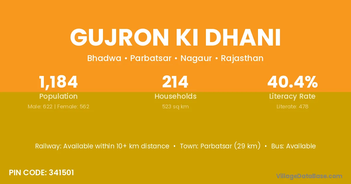 Gujron Ki Dhani village has a total population of 1,184 people, of which 622 are males and 562 are females.