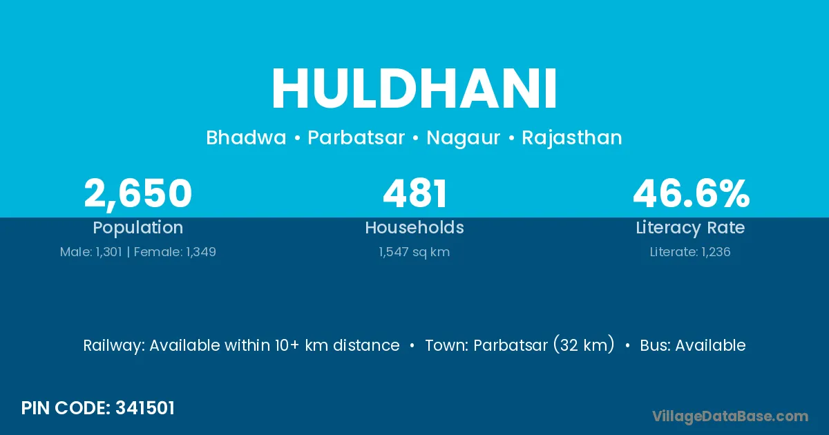 Parbatsar (32 km) is the nearest town to Huldhani village for major economic activities and is located approximately 32 km away.