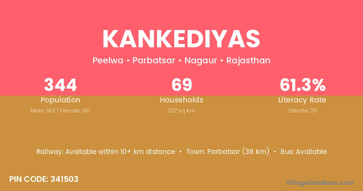 Parbatsar (36 km) is the nearest town to Kankediyas village for major economic activities and is located approximately 36 km away.