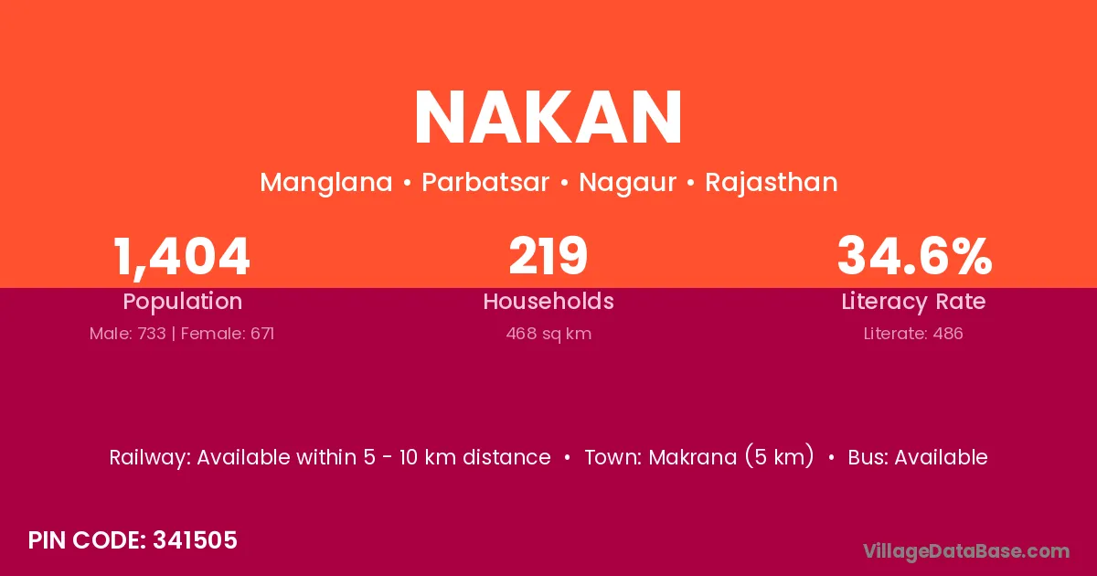 Makrana (5 km) is the nearest town to Nakan village for major economic activities and is located approximately 5 km away.