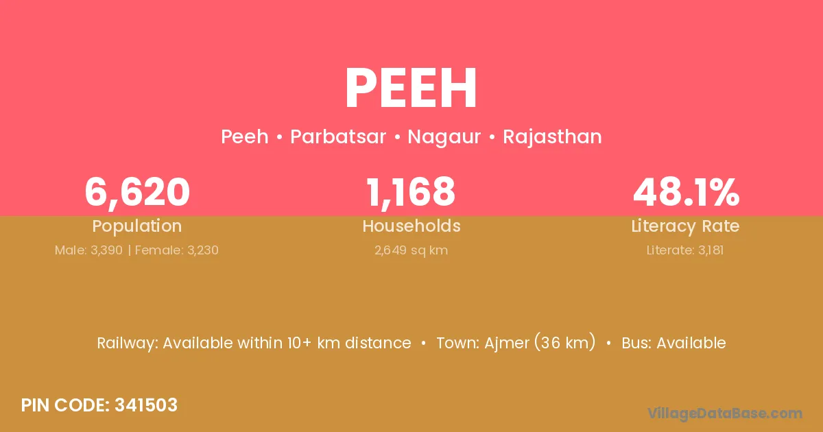 Ajmer (36 km) is the nearest town to Peeh village for major economic activities and is located approximately 36 km away.