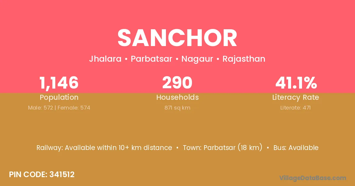 Parbatsar (18 km) is the nearest town to Sanchor village for major economic activities and is located approximately 18 km away.