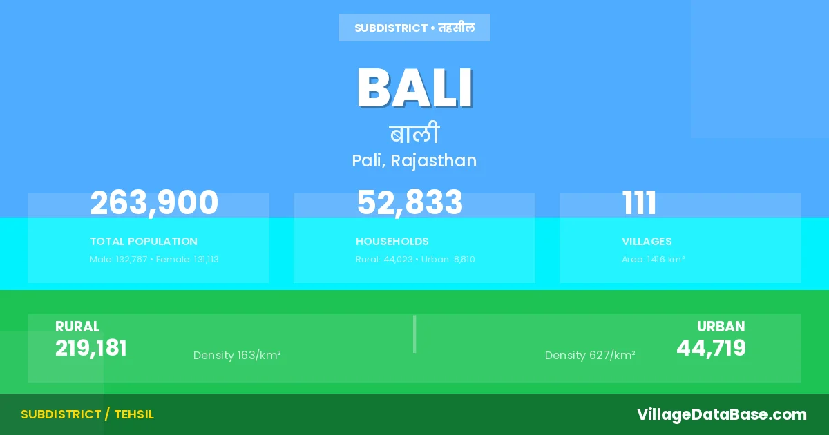According to the 2011 census The total area of Bali Tehsil is 1416 km², with a population of 263900 people. The population density is 186 inhabitants per square kilometre, and there are approximately 52833 houses in the sub district.