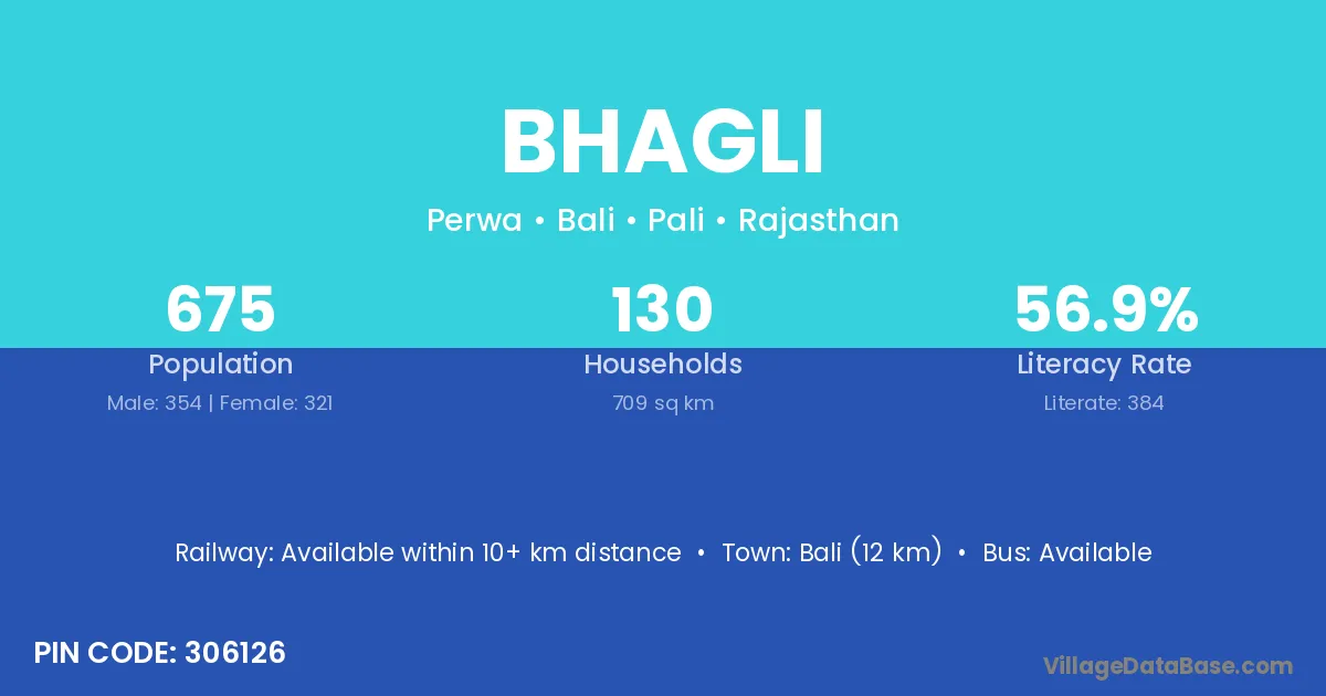 Bali (12 km) is the nearest town to Bhagli village for major economic activities and is located approximately 12 km away.