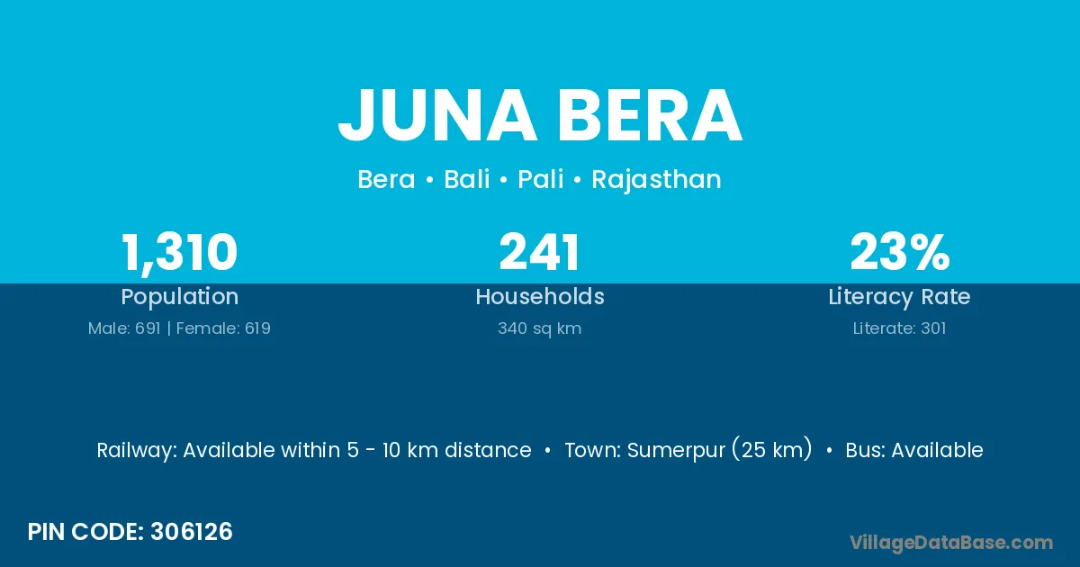 Sumerpur (25 km) is the nearest town to Juna Bera village for major economic activities and is located approximately 25 km away.