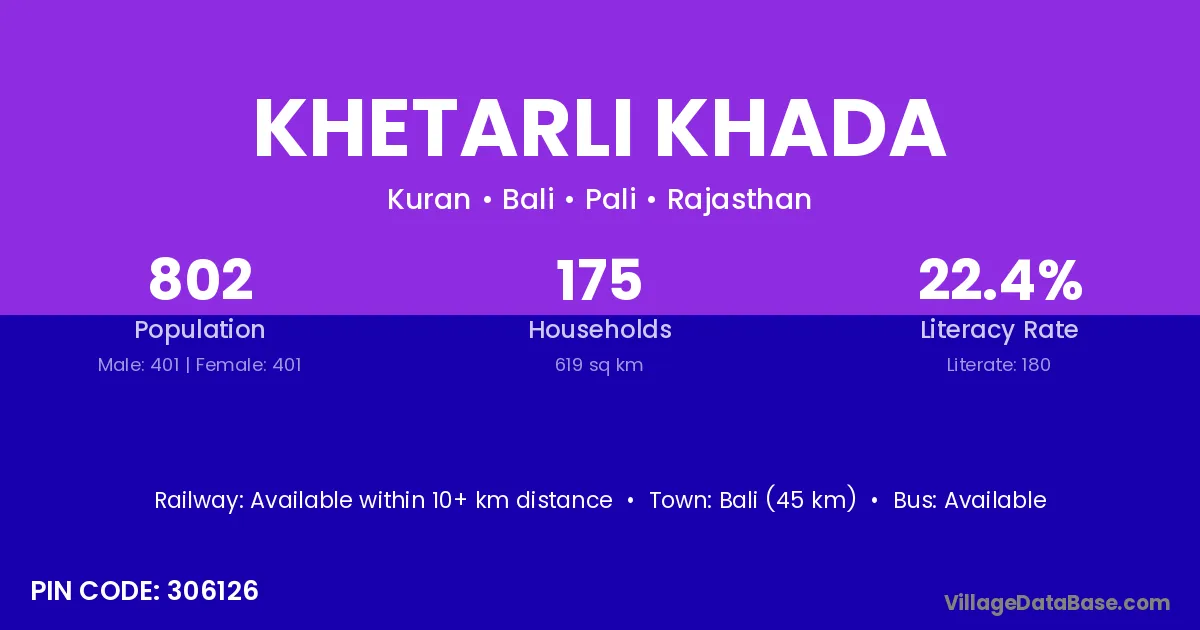 Bali (45 km) is the nearest town to Khetarli Khada village for major economic activities and is located approximately 45 km away.