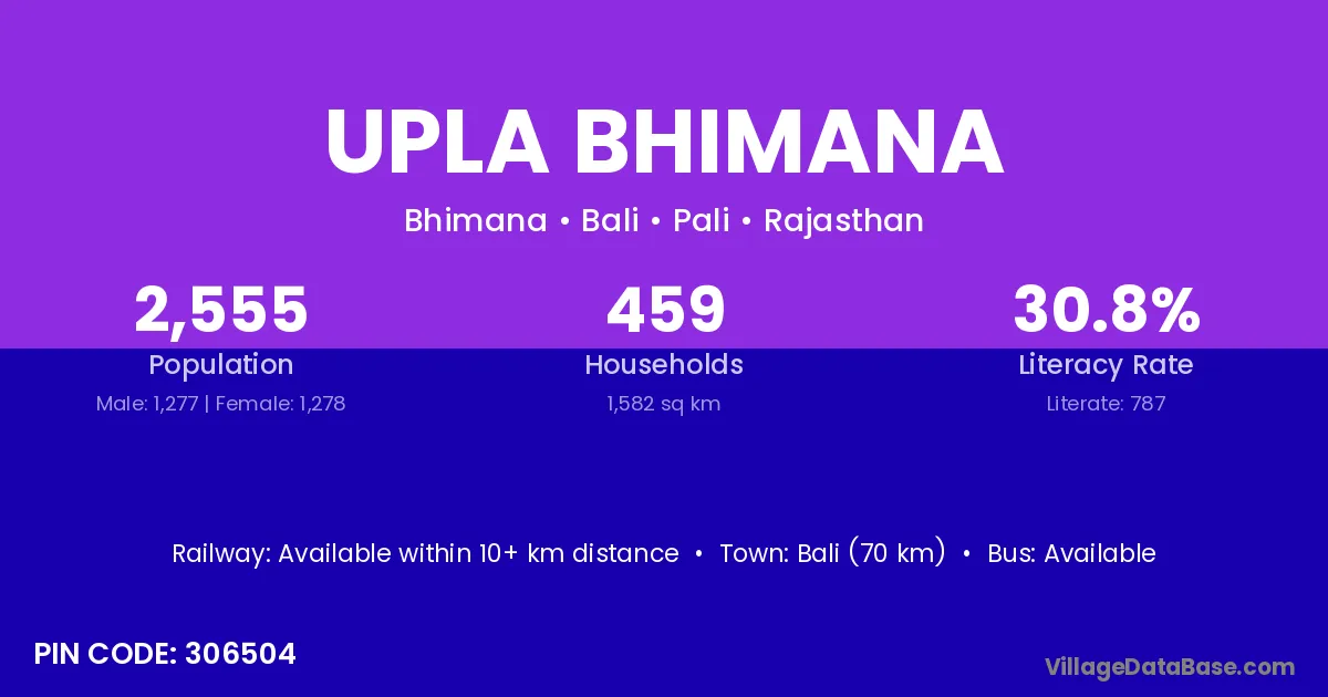 Bali (70 km) is the nearest town to Upla Bhimana village for major economic activities and is located approximately 70 km away.
