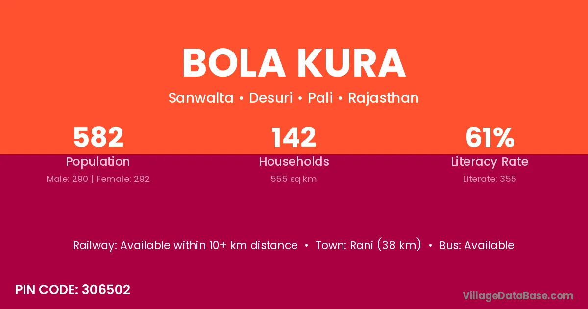 Rani (38 km) is the nearest town to Bola Kura village for major economic activities and is located approximately 38 km away.