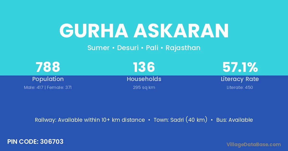 Sadri (40 km) is the nearest town to Gurha Askaran village for major economic activities and is located approximately 40 km away.