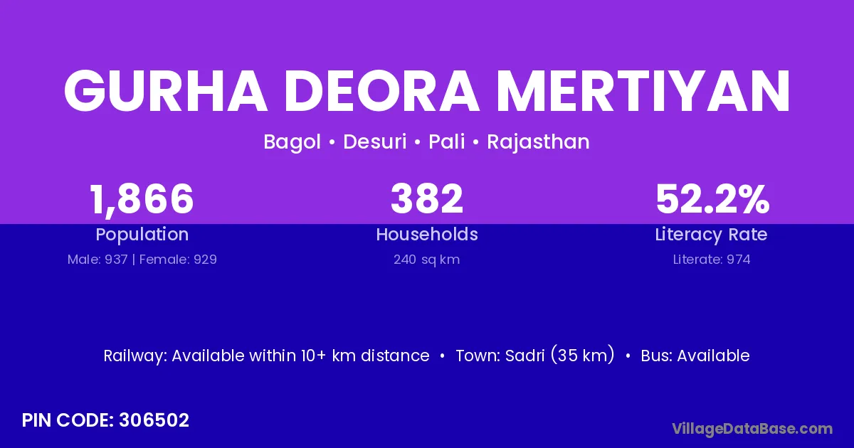 Gurha Deora Mertiyan village has a total population of 1,866 people, of which 937 are males and 929 are females.
