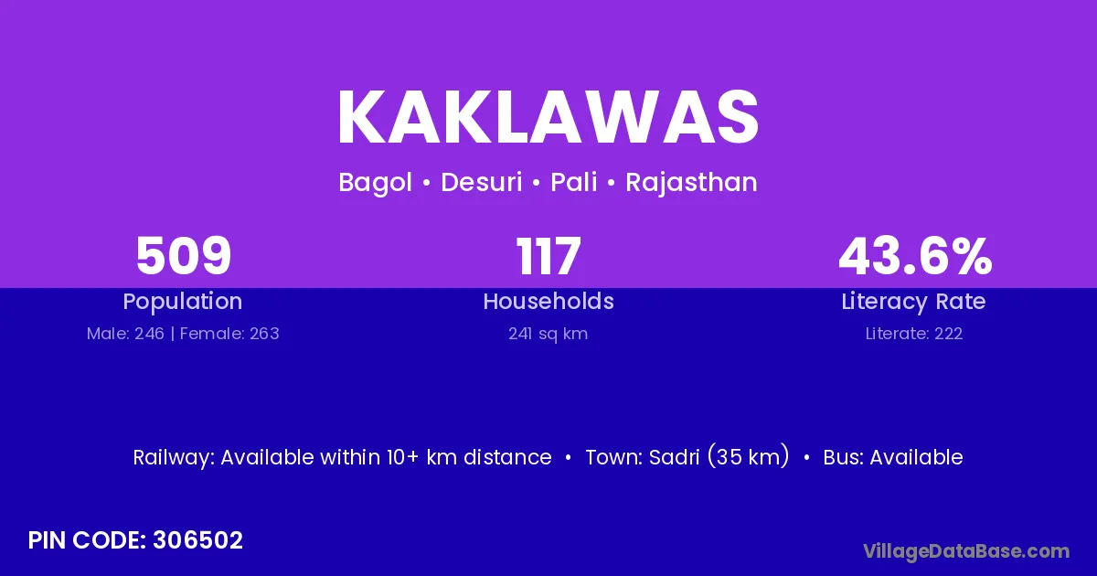 Sadri (35 km) is the nearest town to Kaklawas village for major economic activities and is located approximately 35 km away.