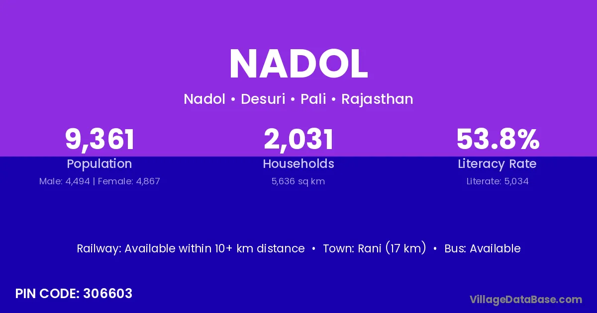 Rani (17 km) is the nearest town to Nadol village for major economic activities and is located approximately 17 km away.