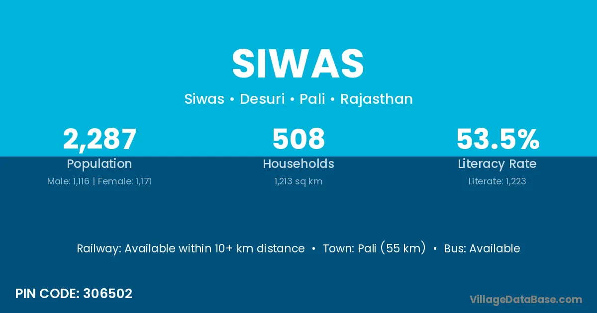 Pali (55 km) is the nearest town to Siwas village for major economic activities and is located approximately 55 km away.