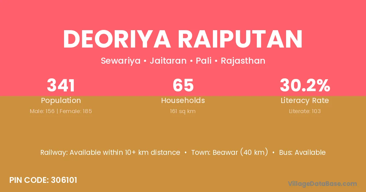Beawar (40 km) is the nearest town to Deoriya Raiputan village for major economic activities and is located approximately 40 km away.