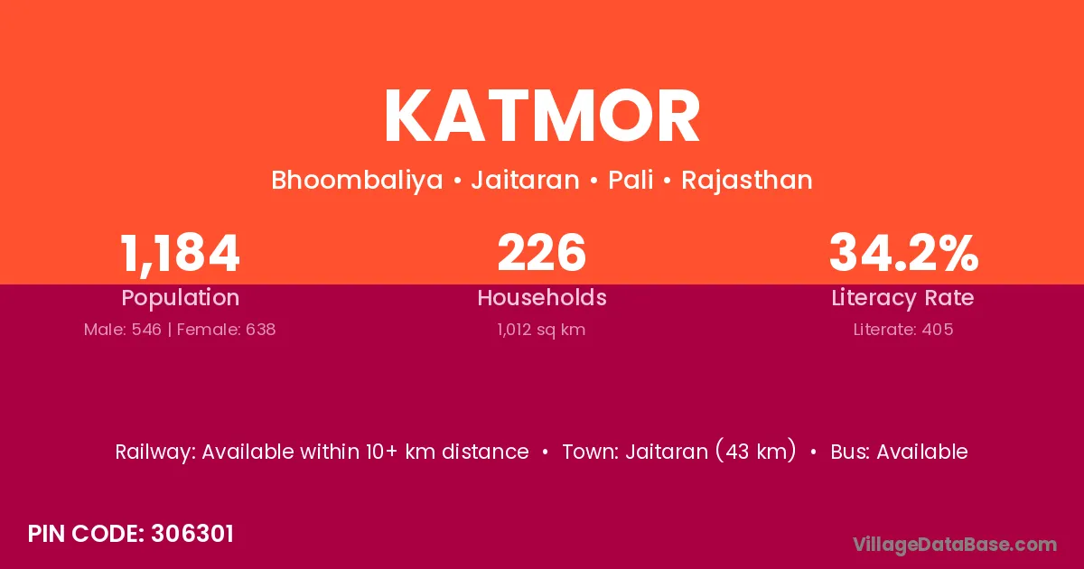 Jaitaran (43 km) is the nearest town to Katmor village for major economic activities and is located approximately 43 km away.