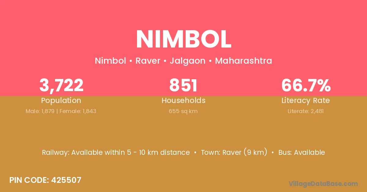 The literacy rate of Nimbol village is 51.58%. Male literacy stands at 64.82% and female literacy at 37.83%.