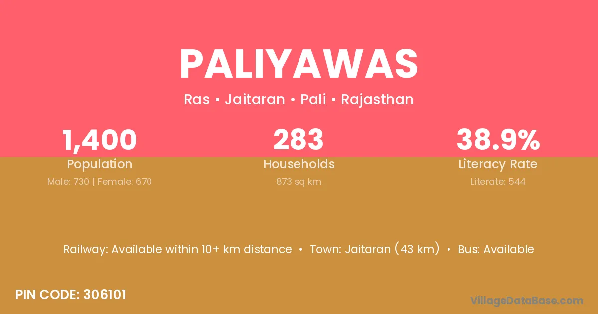 Jaitaran (43 km) is the nearest town to Paliyawas village for major economic activities and is located approximately 43 km away.