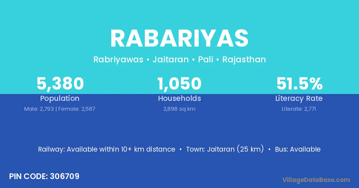 Jaitaran (25 km) is the nearest town to Rabariyas village for major economic activities and is located approximately 25 km away.