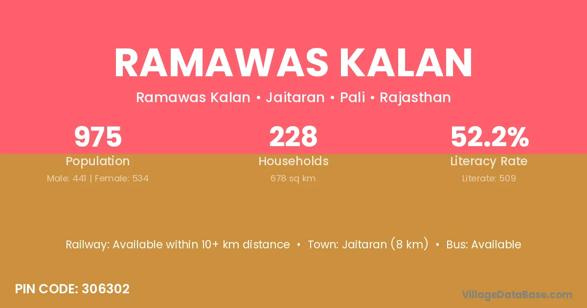 Jaitaran (8 km) is the nearest town to Ramawas Kalan village for major economic activities and is located approximately 8 km away.