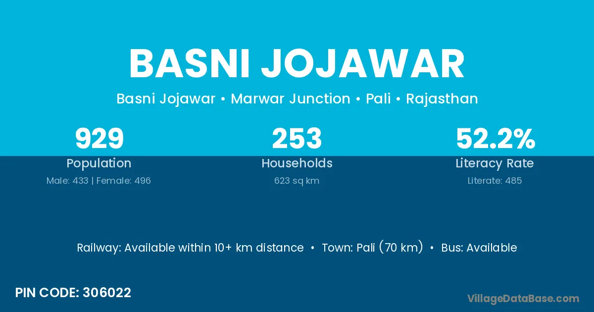 Pali (70 km) is the nearest town to Basni Jojawar village for major economic activities and is located approximately 70 km away.