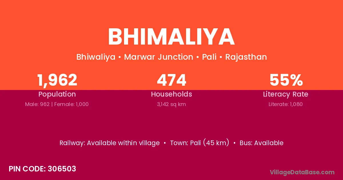 Pali (45 km) is the nearest town to Bhimaliya village for major economic activities and is located approximately 45 km away.