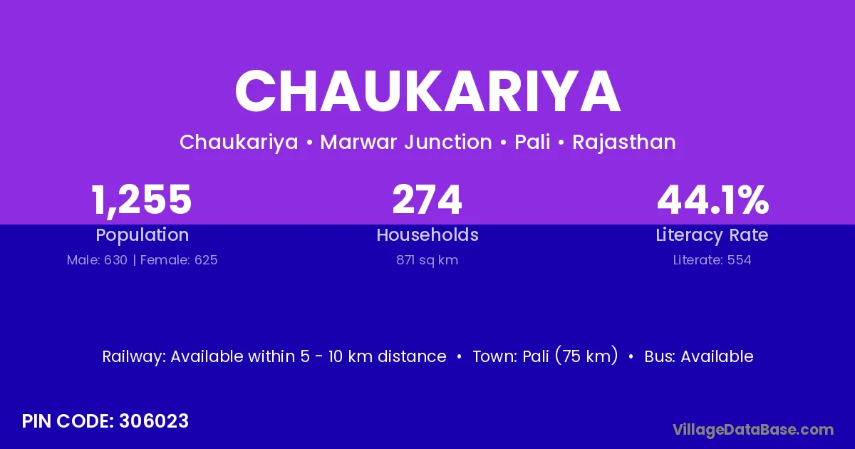 Pali (75 km) is the nearest town to Chaukariya village for major economic activities and is located approximately 75 km away.