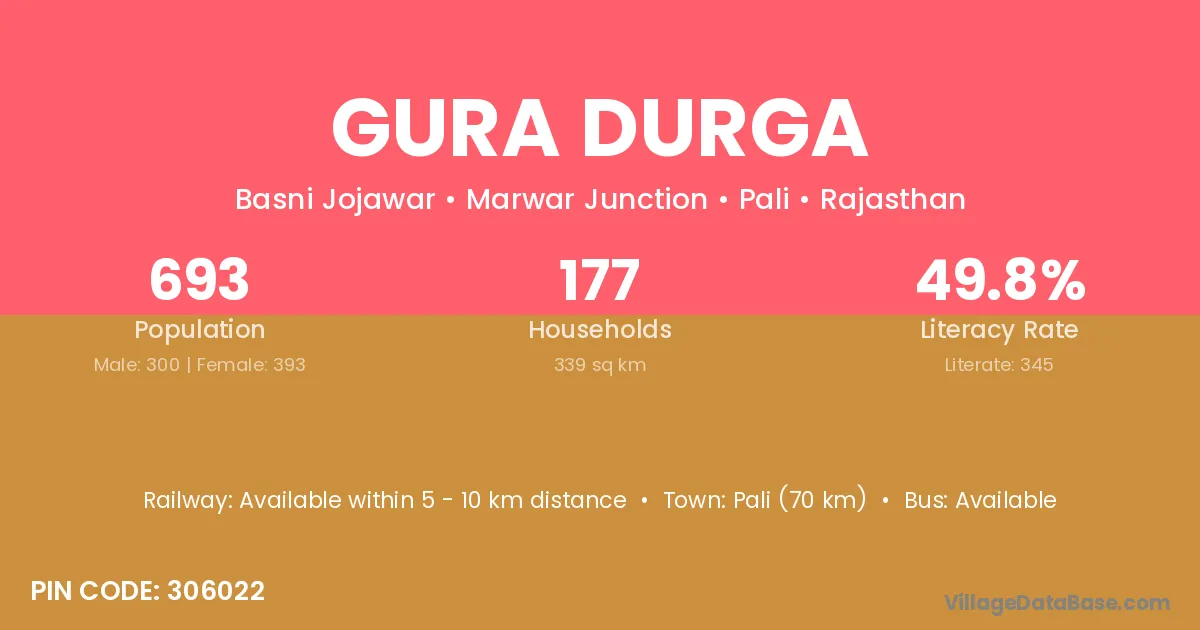 Pali (70 km) is the nearest town to Gura Durga village for major economic activities and is located approximately 70 km away.