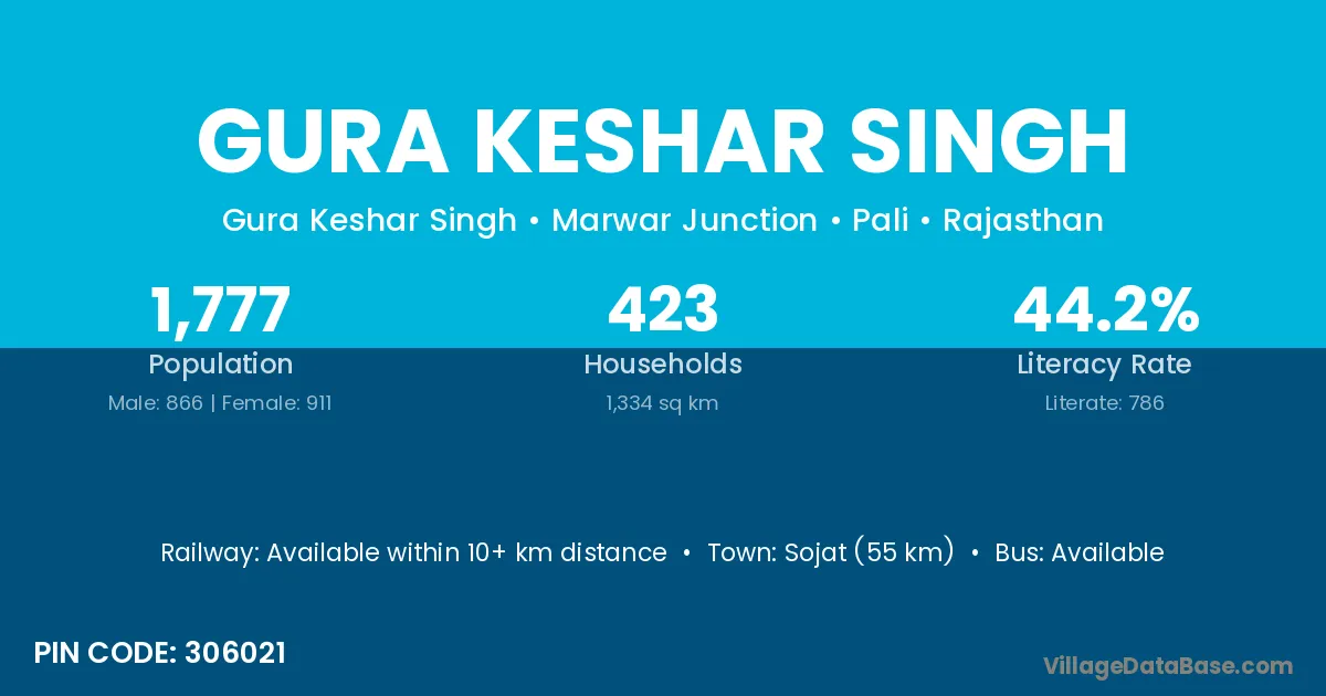 Sojat (55 km) is the nearest town to Gura Keshar Singh village for major economic activities and is located approximately 55 km away.
