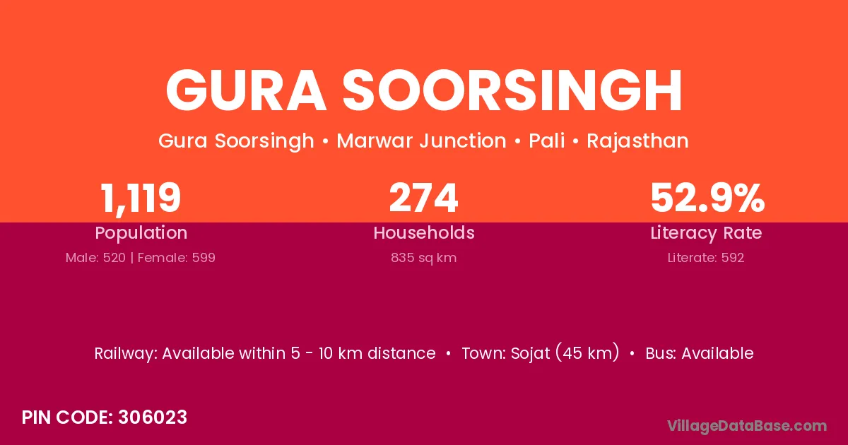 Sojat (45 km) is the nearest town to Gura Soorsingh village for major economic activities and is located approximately 45 km away.