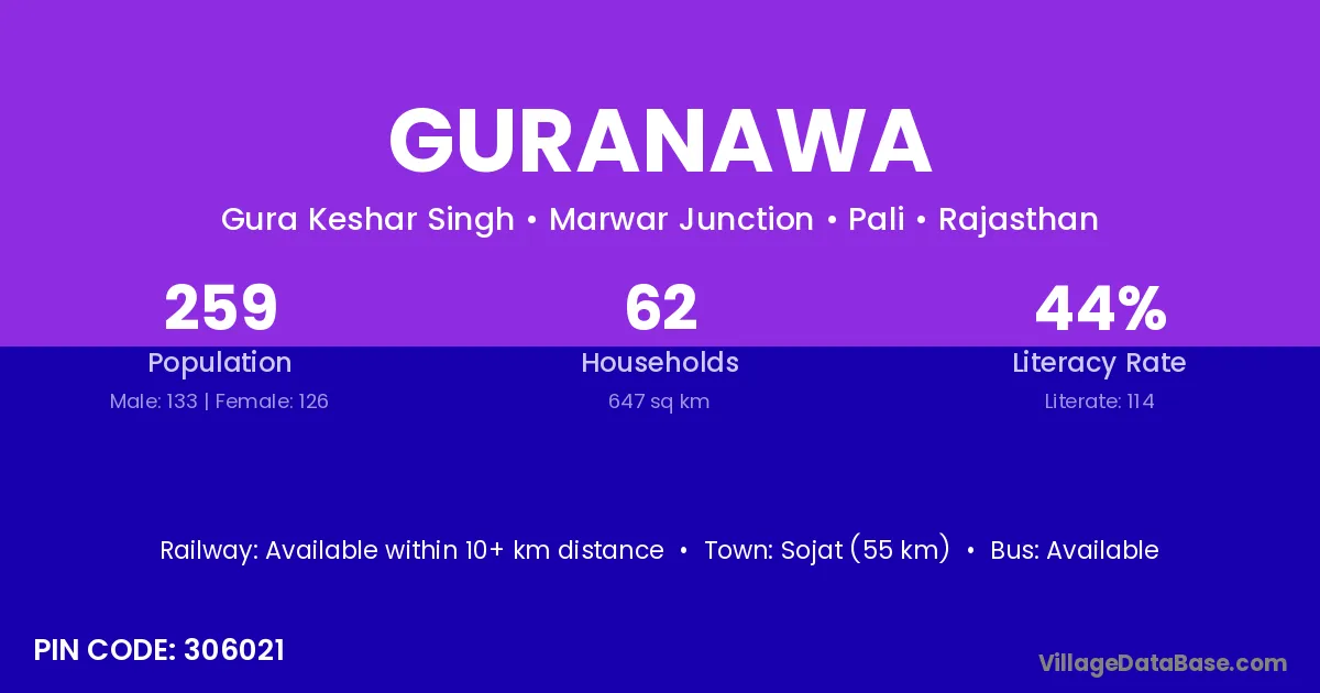 Sojat (55 km) is the nearest town to Guranawa village for major economic activities and is located approximately 55 km away.
