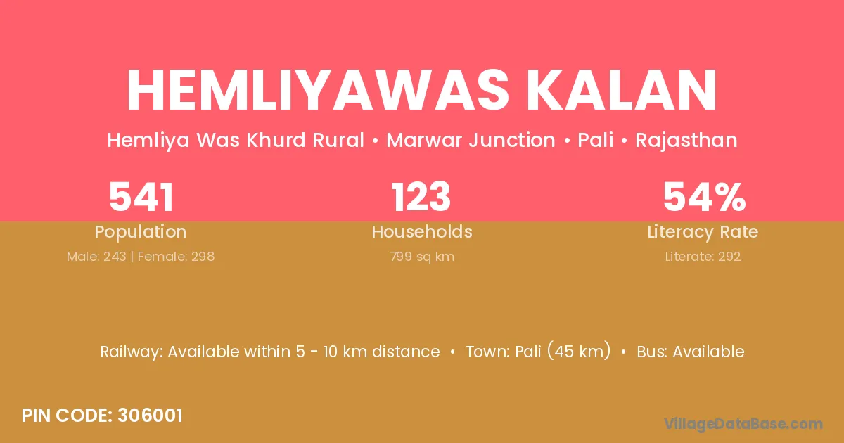 Pali (45 km) is the nearest town to Hemliyawas Kalan village for major economic activities and is located approximately 45 km away.