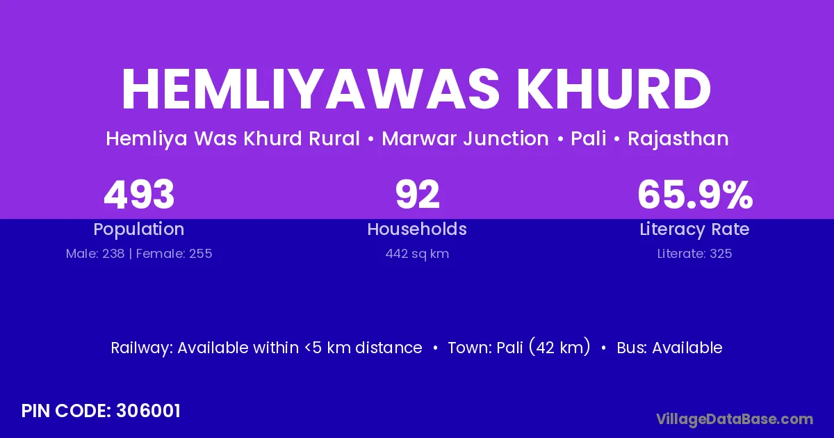 Pali (42 km) is the nearest town to Hemliyawas Khurd village for major economic activities and is located approximately 42 km away.