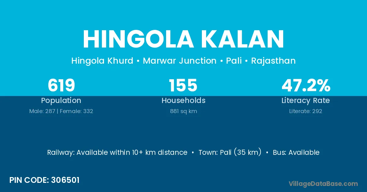 Pali (35 km) is the nearest town to Hingola Kalan village for major economic activities and is located approximately 35 km away.