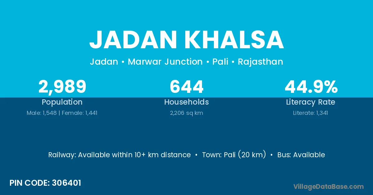 Pali (20 km) is the nearest town to Jadan Khalsa village for major economic activities and is located approximately 20 km away.