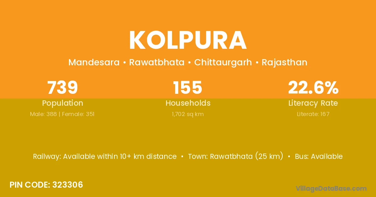 Pali (70 km) is the nearest town to Kolpura village for major economic activities and is located approximately 70 km away.
