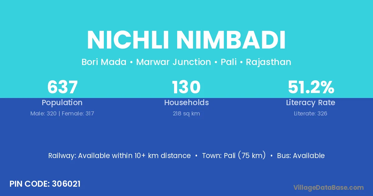 Pali (75 km) is the nearest town to Nichli Nimbadi village for major economic activities and is located approximately 75 km away.