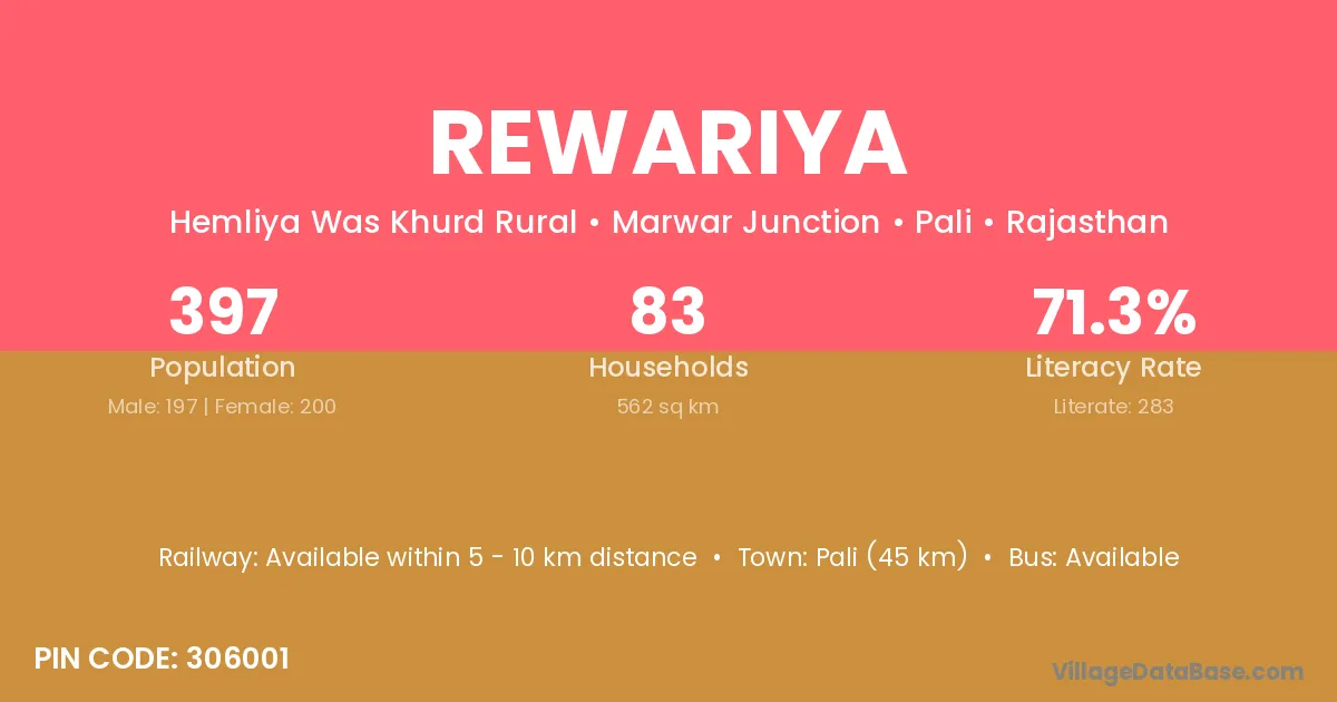Pali (45 km) is the nearest town to Rewariya village for major economic activities and is located approximately 45 km away.
