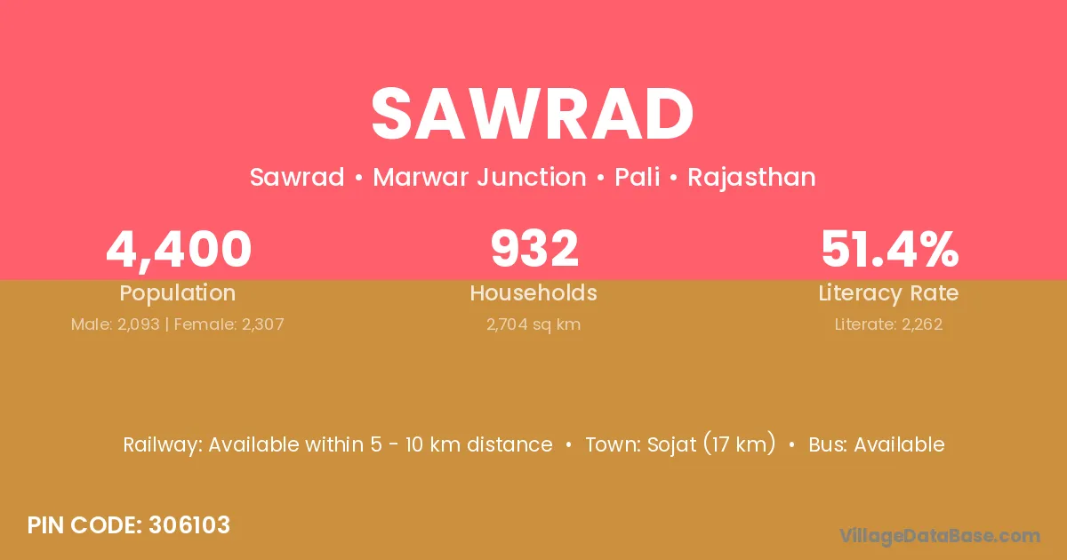 Sojat (17 km) is the nearest town to Sawrad village for major economic activities and is located approximately 17 km away.