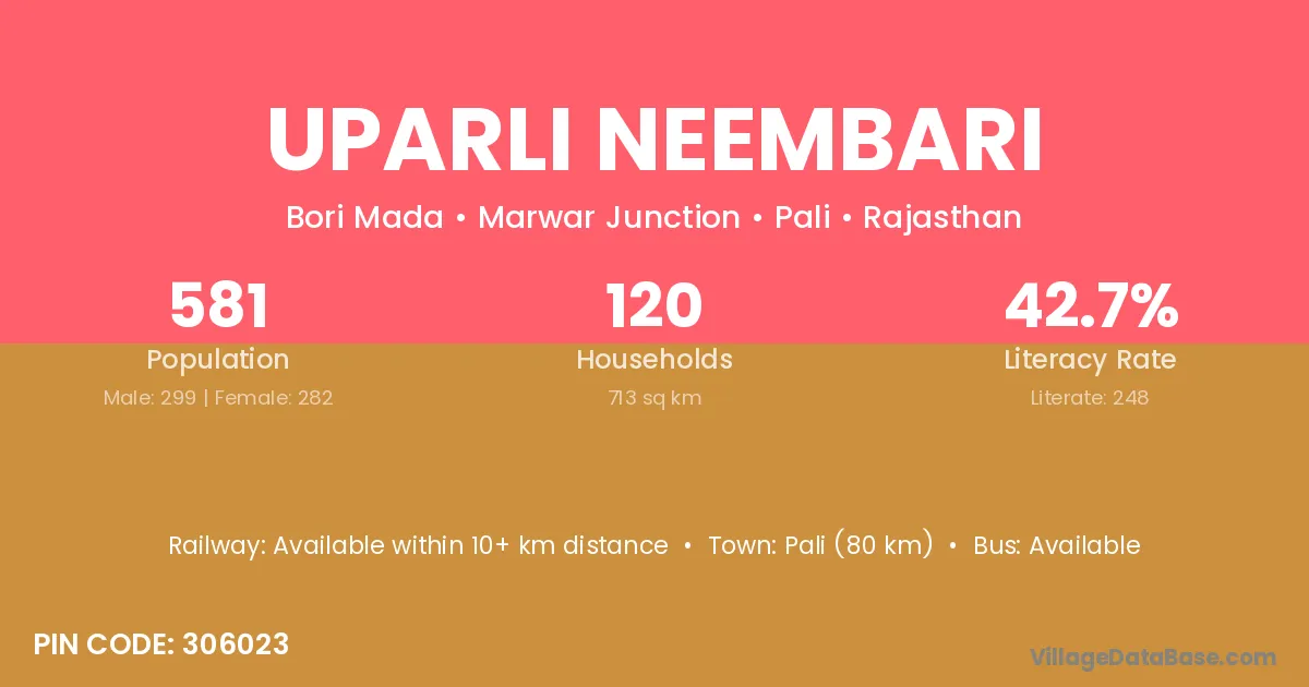 Pali (80 km) is the nearest town to Uparli Neembari village for major economic activities and is located approximately 80 km away.