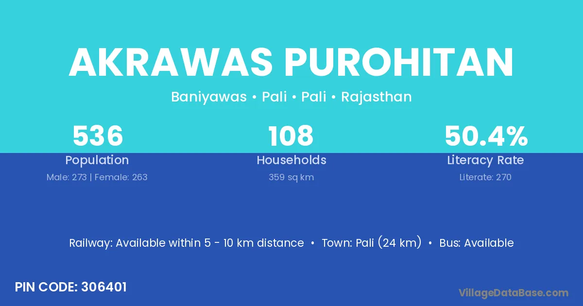 Pali (24 km) is the nearest town to Akrawas Purohitan village for major economic activities and is located approximately 24 km away.