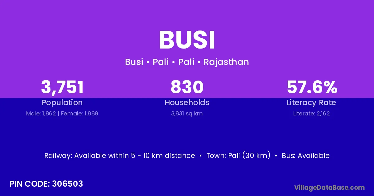 Pali (30 km) is the nearest town to Busi village for major economic activities and is located approximately 30 km away.